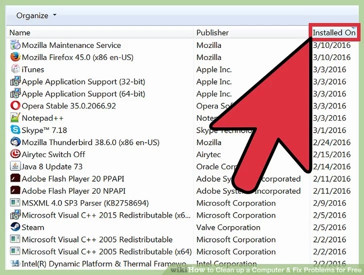 You can sort the list by manually install date, which will allow you to find apps that may happen to be installed recently without your knowing. Undergo each program on this list and make note of the ones that you don't recognize. Perform a web search for each unrecognized entry to find out whether it's an unwanted application.